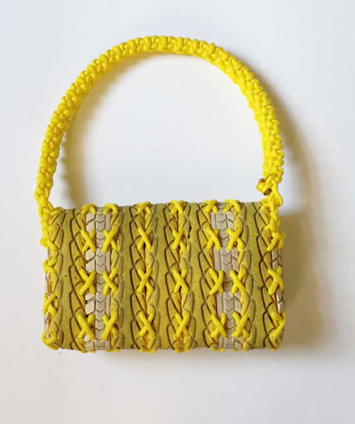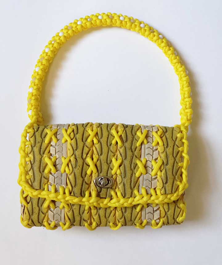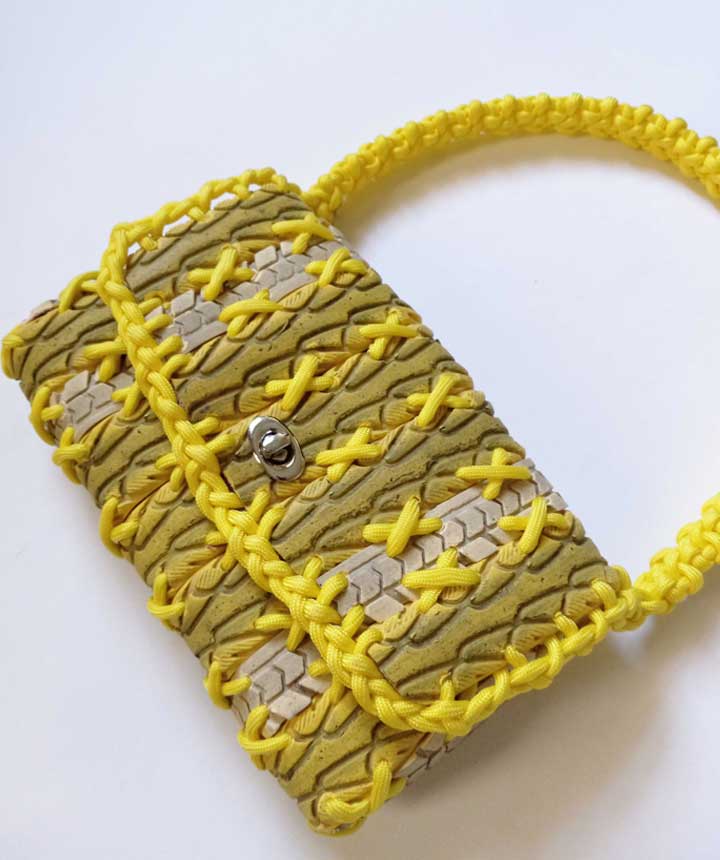 This Maouse evokes a ripe banana. Reclaimed bicycle tires are hand braided together with cord. The handle is braided to resemble flowers with vintage Czech glass beads at their center. Tires are in their original color and are not painted or dyed in any way. Yellow tires are especially rare and difficult to find, making this a unique Maouse variant.