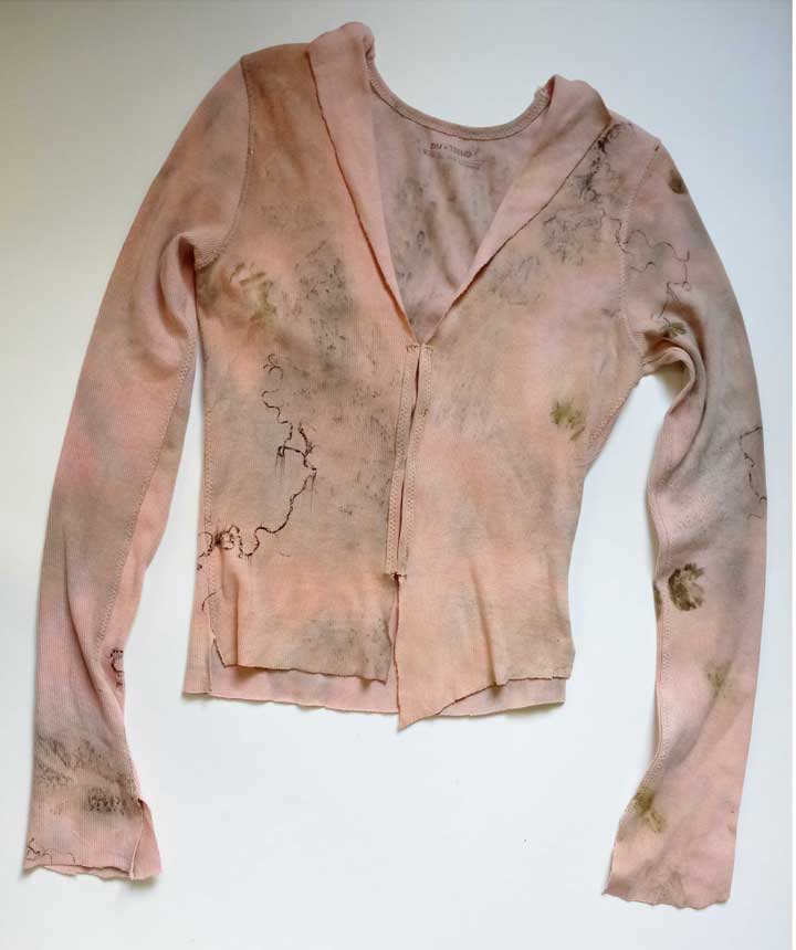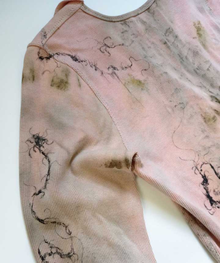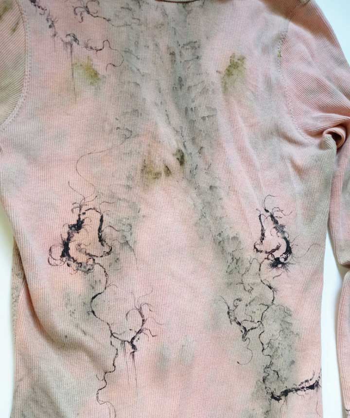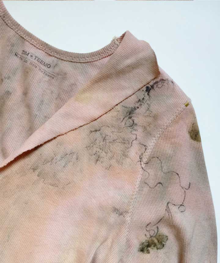 This top is reminiscent of faded tattoos on skin. It's natural surface designed is made from eco printed foliage and flowers. The impressions are created using Zim + Teemo's signature printing technique and hand drawn details. It has a hook and eye center front closure. A one of a kind artifact.