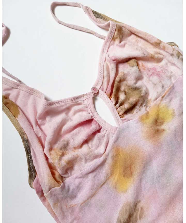 Intuitively designed and made from naturally dyed and eco printed remnants carefully patch worked together to create a unique one of a kind dress. A mosaic where each segment highlights the beauty of nature in all her seasons. Made from foraged flowers and foliage from the designer's neighborhood. A one of a kind artifact.