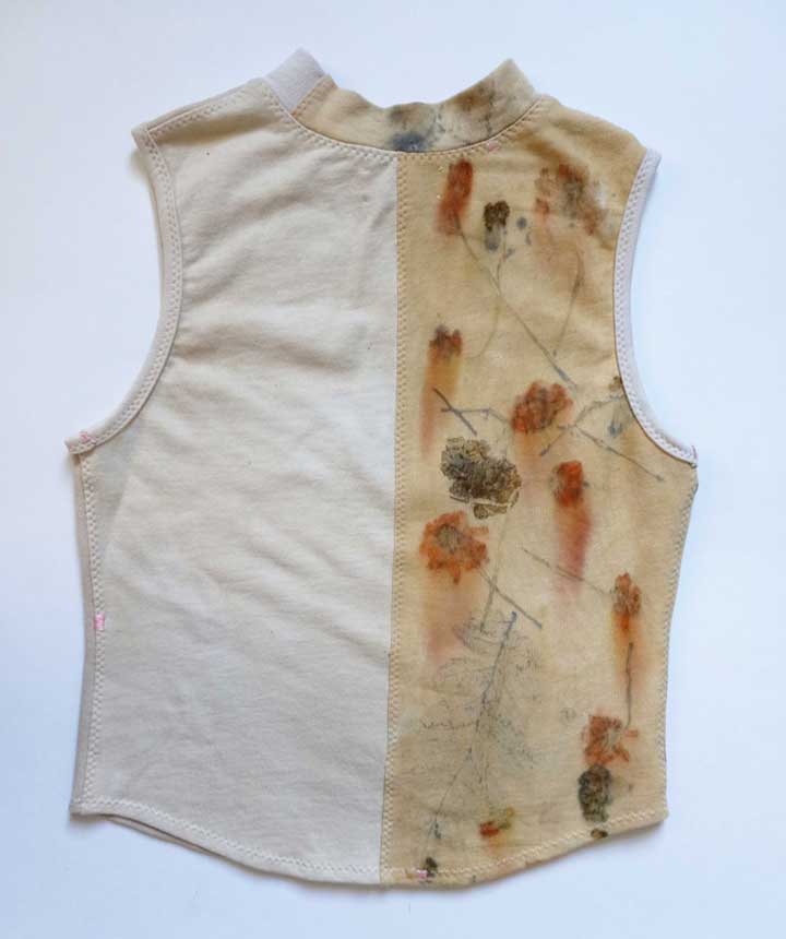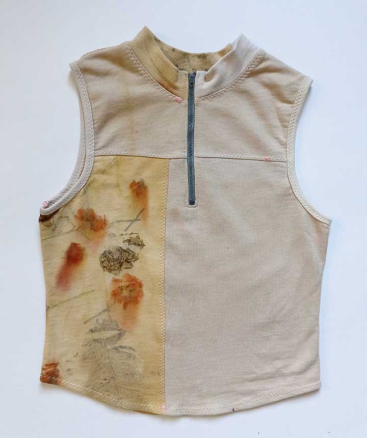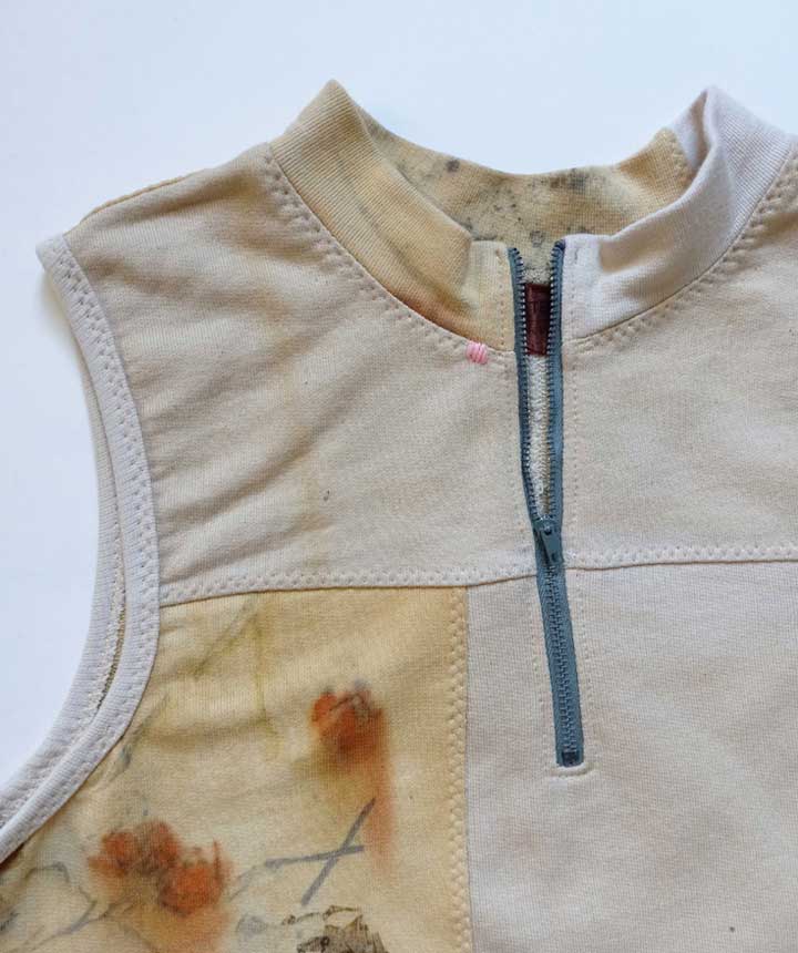 This tank is made from patch worked french terry scraps. Dyed with pomegranate and eco printed with flowers. The vintage cotton tape zipper is sourced from a local thrift shop. It's finished with hand embroidered antique silk threads. This a a one of a kind garment.