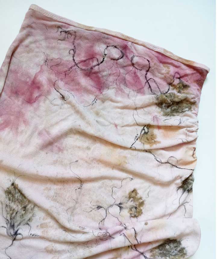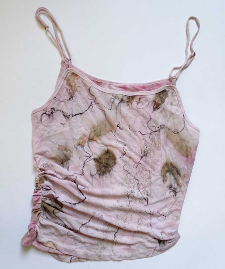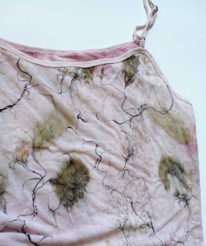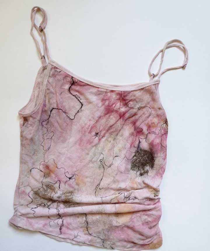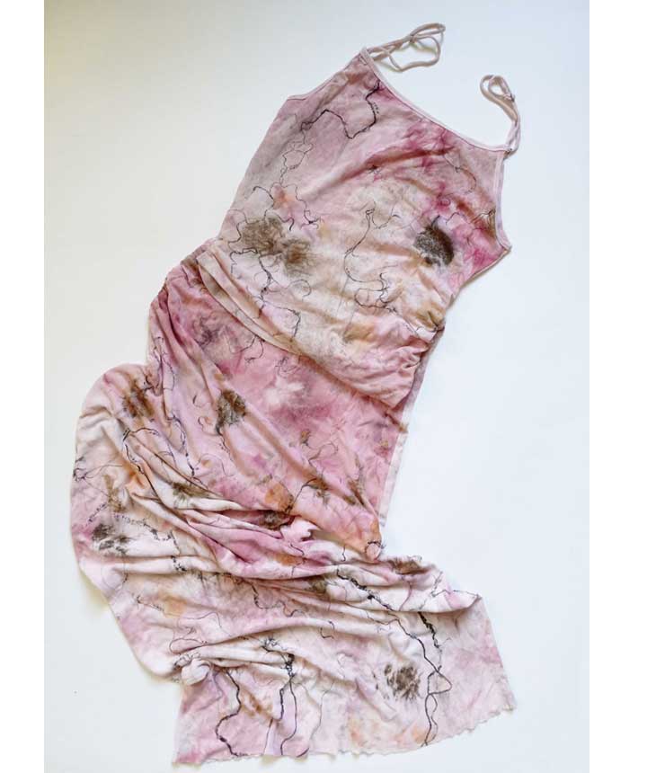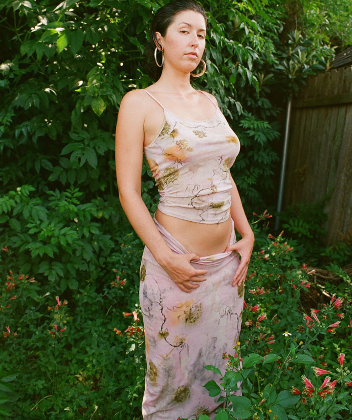 This spaghetti strap top and floor length skirt set is dyed with cochineal and eco printed with summer flowers. The vine like surface design is made from Zim + Teemo's signature printing technique and finished with hand drawn details. The top features adjustable spaghetti straps.